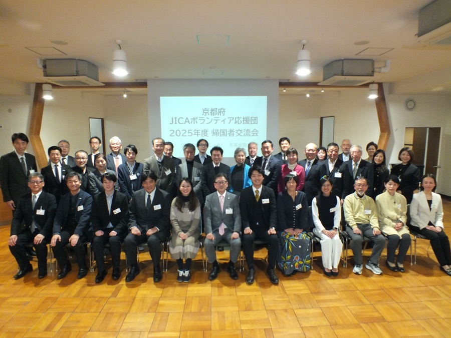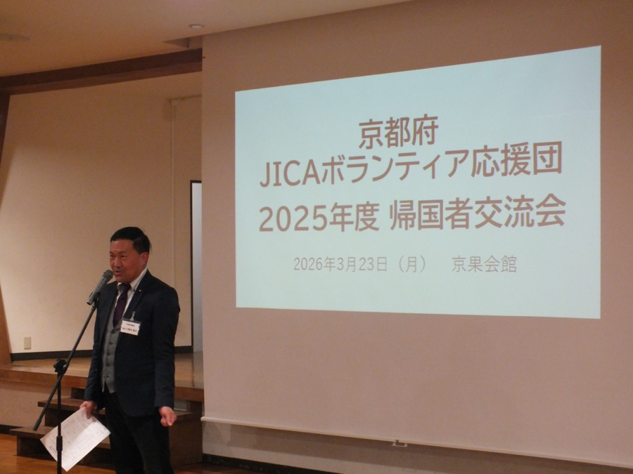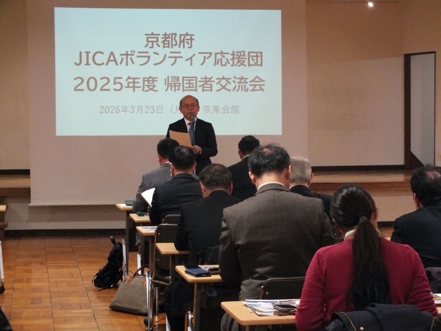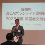 3月23日(月)、下京区にある京都青果センター京果会館で、京都府JICAボランティア応援団主催「帰国者交流会」が開催されました。帰国隊員や関係者、応援団メンバーなど40名が参加し、海外での活動を終えて帰国した隊員の経験を共有するとともに、参加者同士の交流を深める機会となりました。