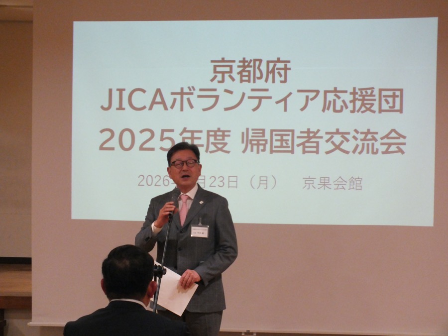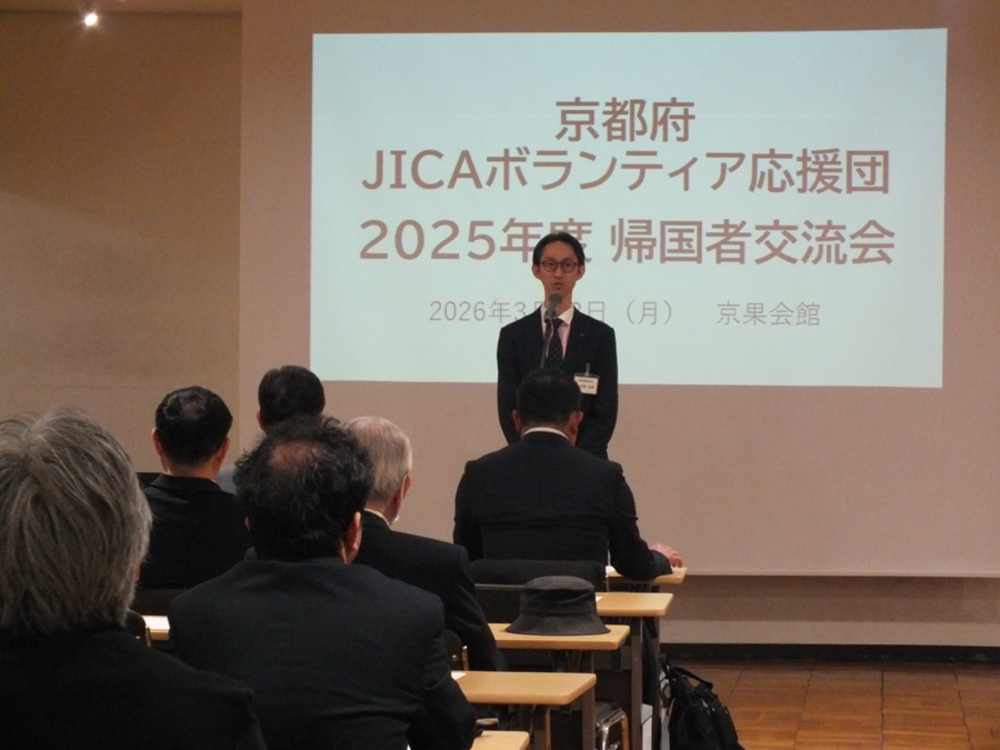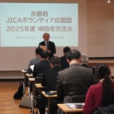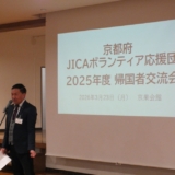 続いて京都府健康福祉部長の井原様よりご挨拶をいただきました。井原部長は、JICA海外協力隊が長年にわたり世界各国で活動してきたことを紹介し、京都からも多くの隊員が海外で活躍してきたことに触れました。帰国隊員が海外で得た経験や知識を京都や日本の地域社会に活かしていくことへの期待を述べられました。